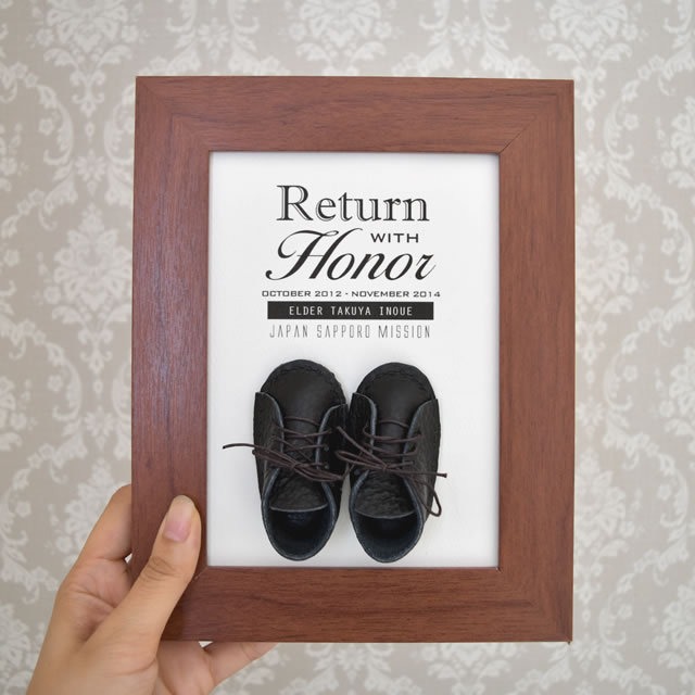 ----------------------------------------------------------------------- 以前ご好評いただいておりましたダークブラウンのフレームが 復活しました!壁掛けにも対応 ----------------------------------------------------------------------- フレームアート "Return with Honor (名誉の帰還)" 帰還宣教師への記念品・プレゼントに。 1)宣教師の名前、2)伝道部、3)期間(年月)を入れられます。 ご注文の際、備考欄に忘れずにご記入ください。 サイズ : 約17.7cm × 22.8cm 台紙サイズ:2L 材質 : 革、紙、MDF カラー : ダークブラウン *壁掛け・スタンドどちらにも対応できます。 ◆国内送料無料 ◆簡易ギフトラッピング無料 ◆受注制作のため、2週間前後お時間をいただいています。 -- For Returned Missionaries. Please let me know 1) the name of missionary, 2) mission, 3) the start date and the end date of mission. Size : approx. 5 × 7 inches Mount Size : 2L Material : Leather, Paper, MDF Color : Dark Brown *Free domestic shipping *Free gift wrapping *An item will be shipped within two weeks after receiving the receipt of your payment.
