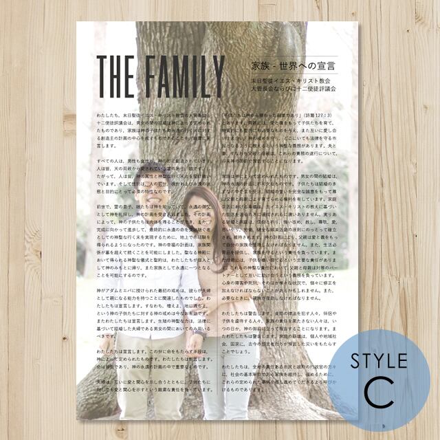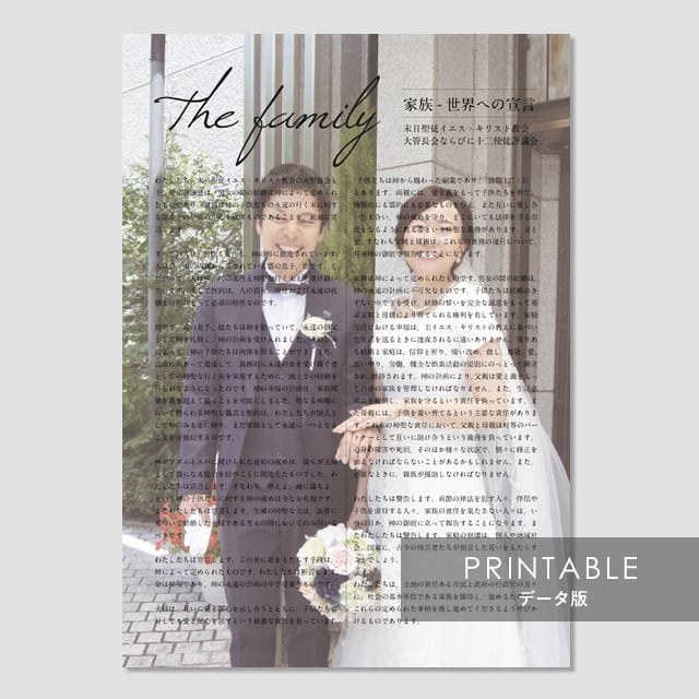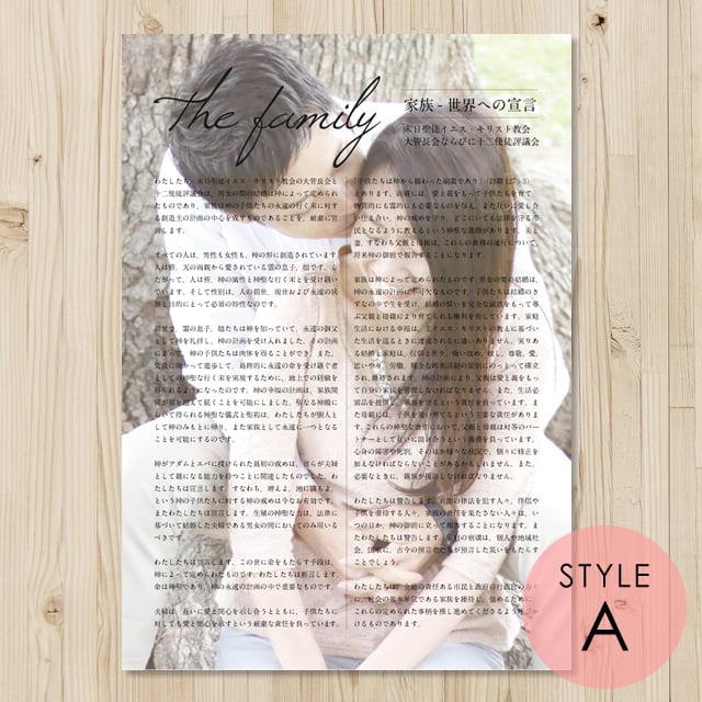 「家族 - 世界への宣言」の文言の背景にお好きな写真(結婚の時の写真、家族写真、神殿の写真など)を1枚お入れしてデザインします。